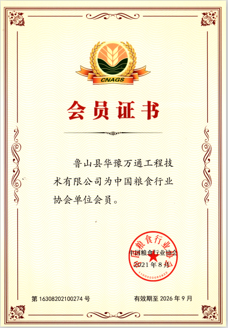 2021年8月,中国粮食行业协会经多方位考察,授予鲁山县利来工程技术有限公司评会员单位称号,并颁发会员单位证书。